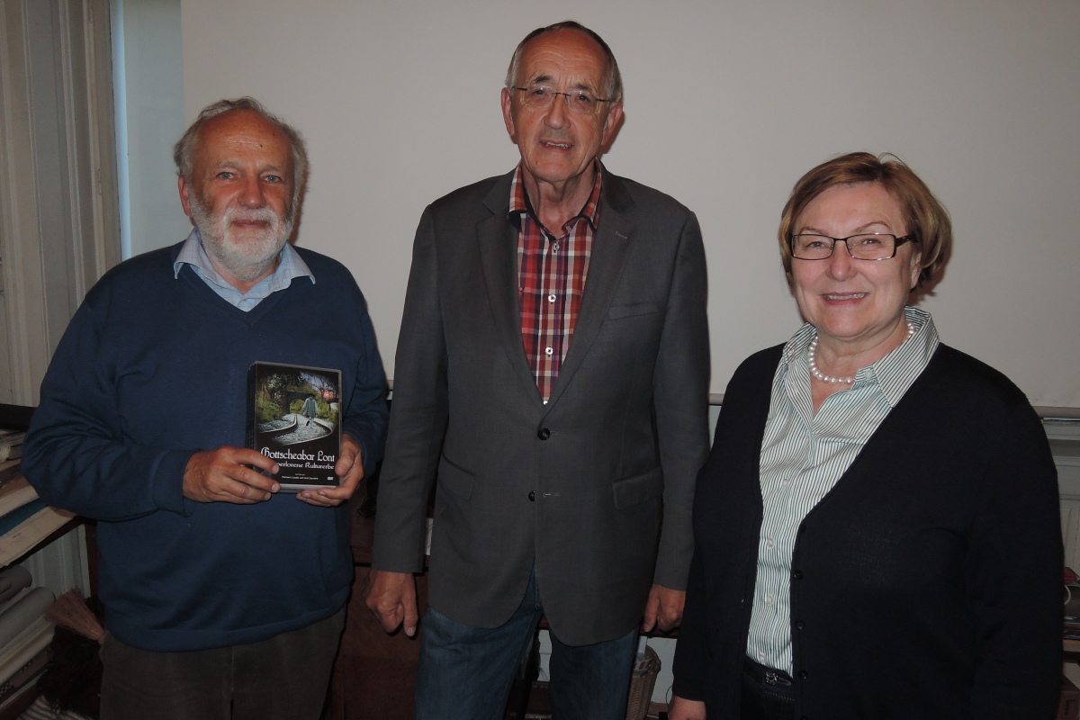 Filmvorführung des Filmes „Gottscheabar Lont …“ am 15.6.2016 im Sprachinselmuseum. Vors.Stv. OR Dr. Franz Grieshofer, Produzent OR Mag.Ing. Hermann Leustik und Vorsitzende OR Dr. Ingeborg Geyer. Foto: Claudia Gerstl