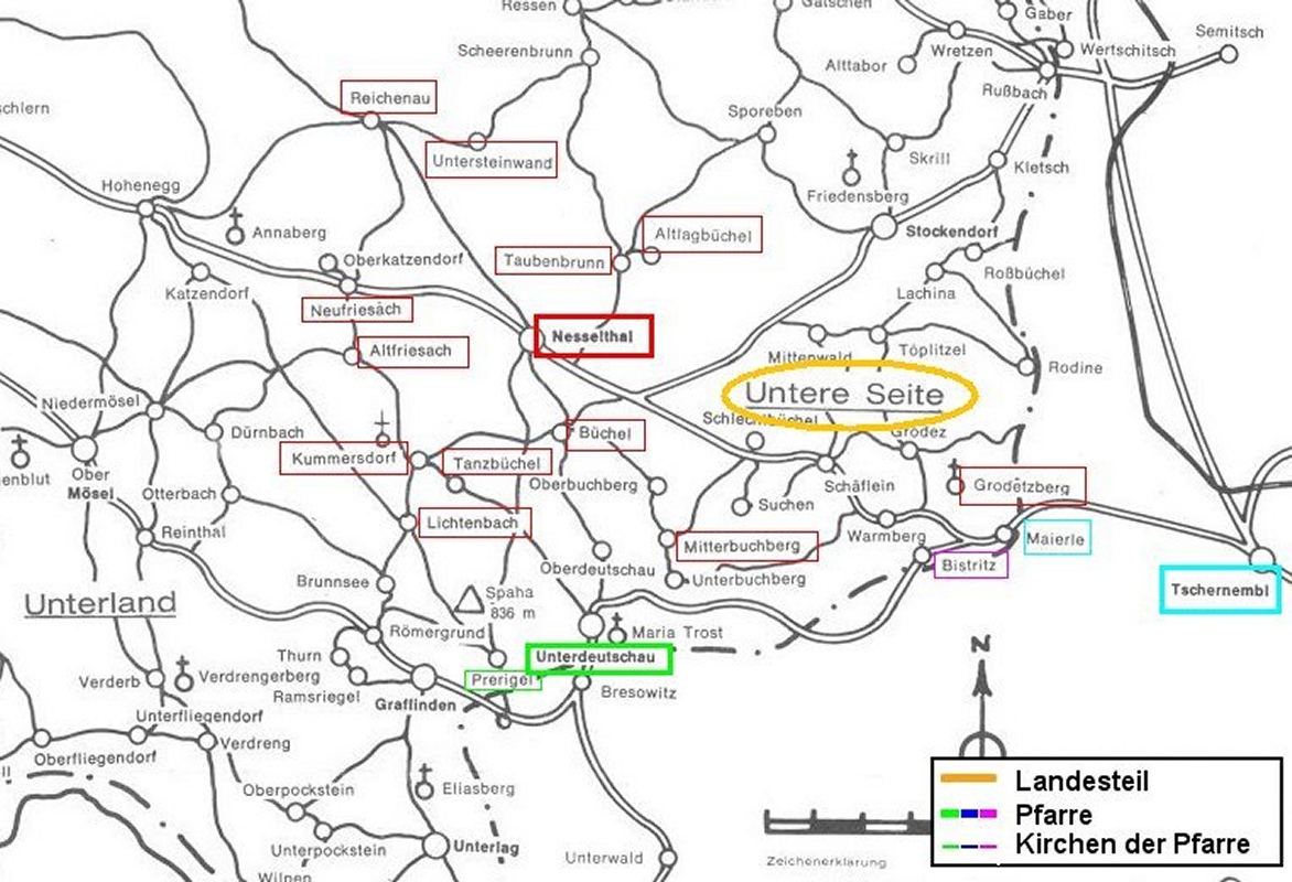 Zur Pfarre Unterdeutschau gehörten die Orte Bresowitz (Brezovica), Preriegel (Prerigelj), Saderz (Zaderc), Unterdeutschau (Nemska loka), Wieden (Videm) und die slowenischen Orte Kralm (Kralj), Wimol (Vimolj) und Tscheplach (Ceplje).