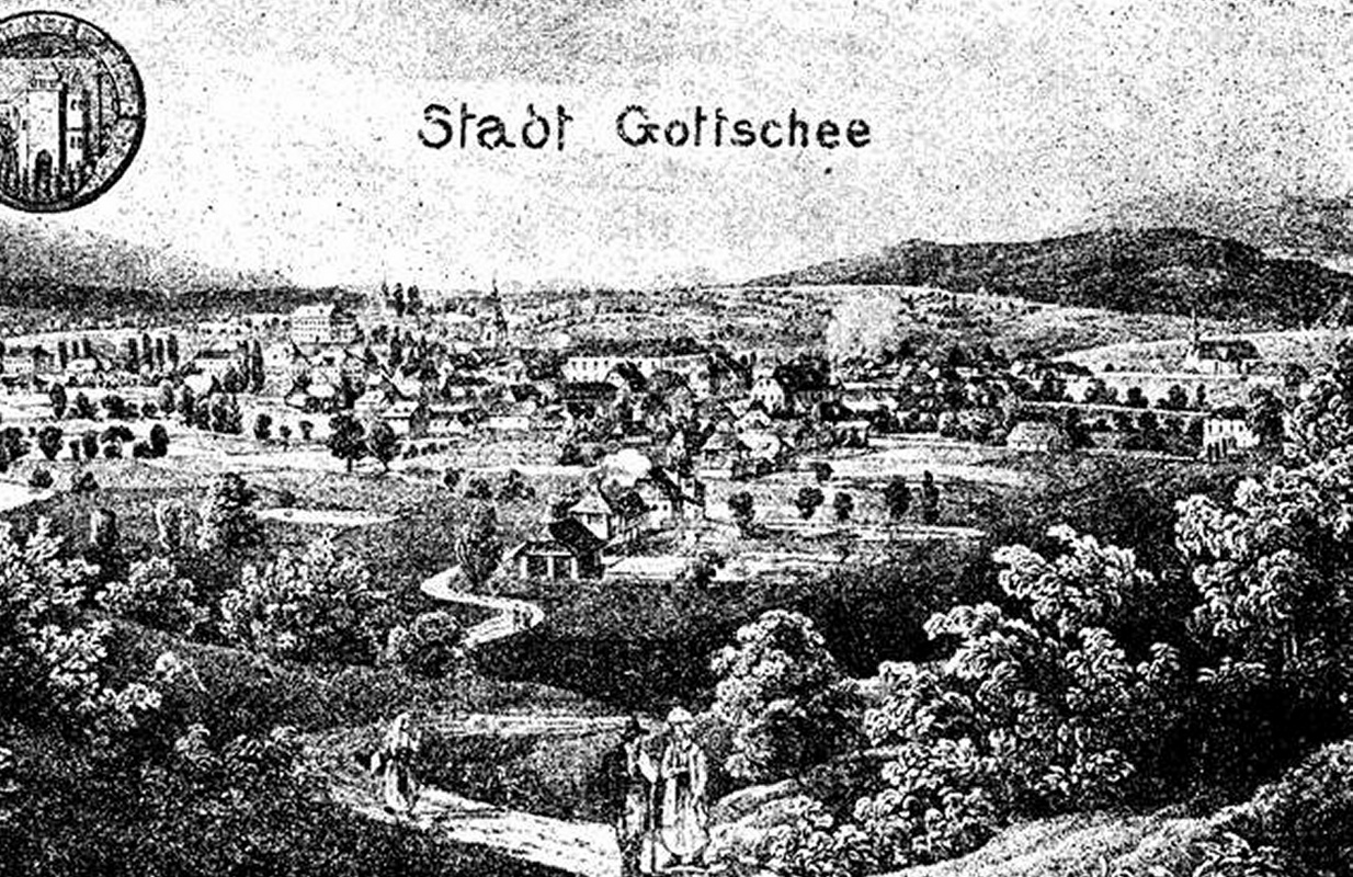 Kaiser Friedrich III. erhob Gottschee zur Stadt und begabte es mit städtischen Freiheiten und mit einem Wappen, dessen Abbildung auf unserem oben gebotenen Bilde in der linken oberen Ecke zu sehen ist. Wie Gottschee in den nun folgenden Jahrhunderten aussah und wahrscheinlich bis gegen das Ende des 18. Jahrhunderts verblieb, zeigt uns das Bild der Stadt in Valvasors „Ehre des Herzogtums Krain“. Die Türkenkriege hörten auf, die Festungsmauern wurden abgetragen. Aus ihren Steinen wurden in der Stadt die ersten Steinhäuser errichtet (mit Ziegelbauten wurde erst in der ersten Hälfte des 19. Jahrhunderts begonnen), während es früher – abgesehen vom Schlosse – nur hölzerne Bauten gegeben hatte. Daher auch die verheerenden Stadtbrände in den Jahren 1515, 1596 und 1684, wo binnen wenigen Stunden das ganze Städtchen bis auf den Grund niederbrannte. Gottschee bekam nun allmählich das Aussehen, wie wir es auf unserem oben zur Darstellung gebrachten Bilde finden. Dieses Bild ist nach einer Lithographie von Jos. Wagner in Klagenfurt gezeichnet und heuer (1920) vom „Verein Gottscheerland“ Klagenfurt neu herausgegeben worden. Gottschee um 1850 zeigt auf dem Friedhofe noch die alte Pfarrkirche, die im Jahre 1873 abgetragen wurde. In der Berggasse standen damals nur zwei Ziegeleien. im späteren Fachschulgebäude war eine Dampfmühle untergebracht.