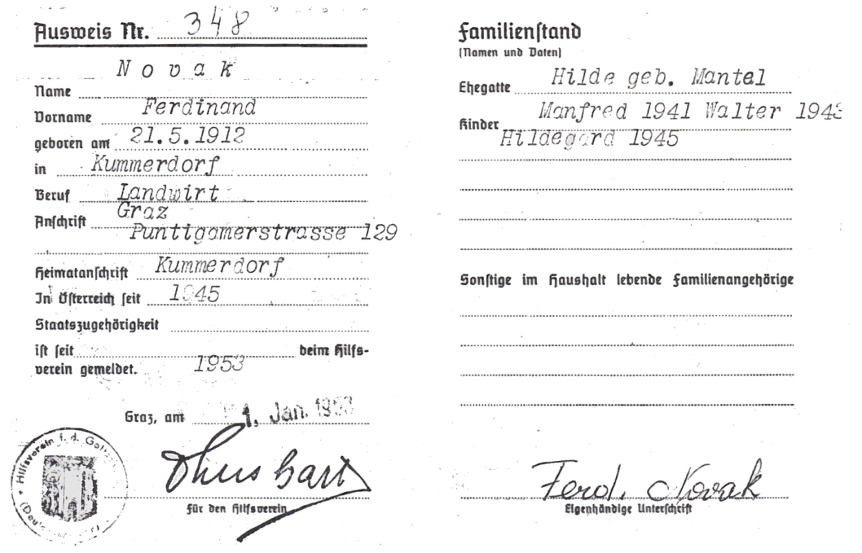 Der Ausweis des Hilfsvereins für die Gottscheer (Deutschkrainer) in Graz trug auf der ersten Seite den Namen des Vereins sowie das Gottscheer Wappen mit einem sinnigen Spruch. auf der letzten Seite waren acht Kästchen für die Bestätigung des eingezahlten Jahresbeitrages, der „mindestens“ 24 Schilling betrug, angebracht. Die beiden Innenseiten des Ausweises Nr. 348, lautend auf Ferdinand Novak, seine Frau Hilde, geborene Mantel und die drei Kinder, sehen wir auf dem Bilde. Der Ausweis wurde am 1. Jänner 1953 ausgestellt und von Prim. Dr. Linhart gezeichnet.